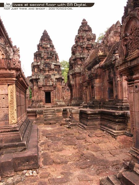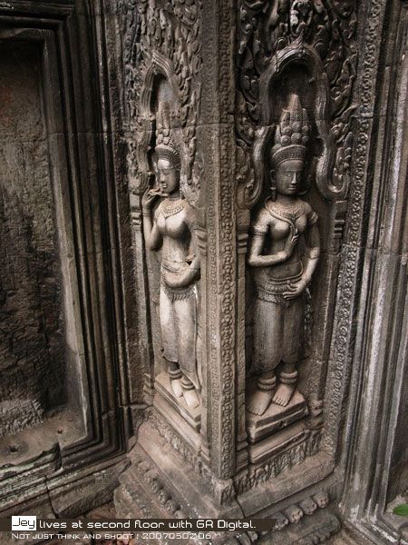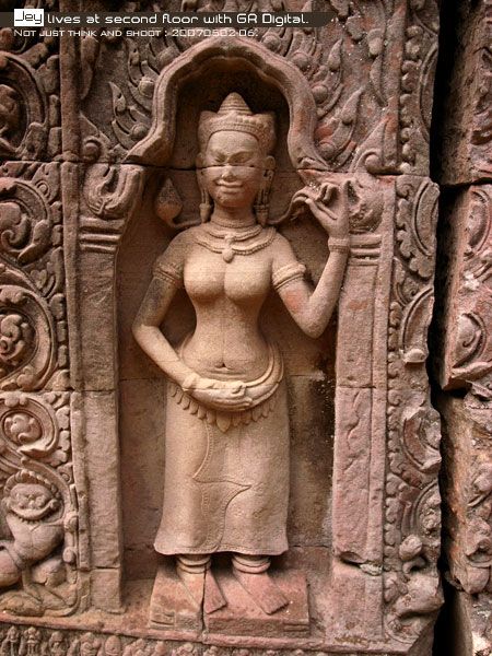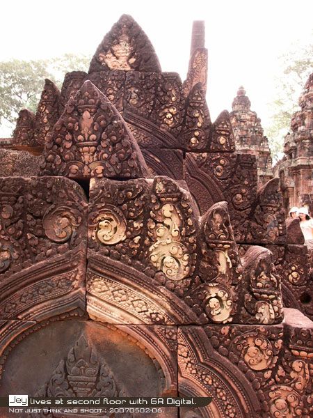 班蒂斯蕾Banteay Srei,又名女皇宮,建立於十世紀,供奉著婆羅門教三大天神的破壞神濕婆神。果然享有吳哥「藝術之鑽」美譽的班蒂斯蕾古神殿,建築顏色為粉紅色,用火山岩所建造,石雕精緻纖柔,層次分明,巧奪天工,真的是全吳哥遺址中最精細的。雕刻美!藉由壁畫浮雕瞭解的吳哥神話也美!
