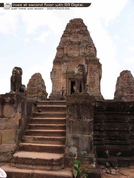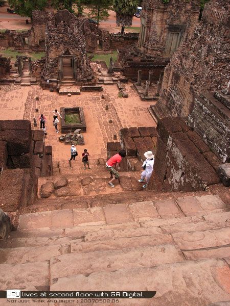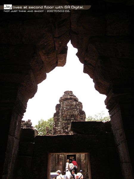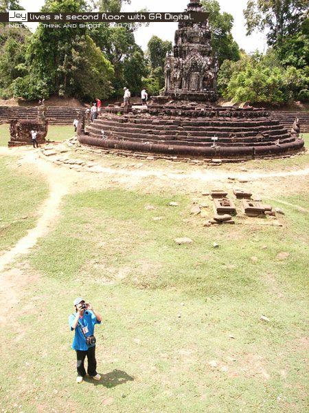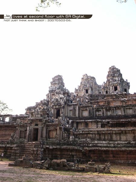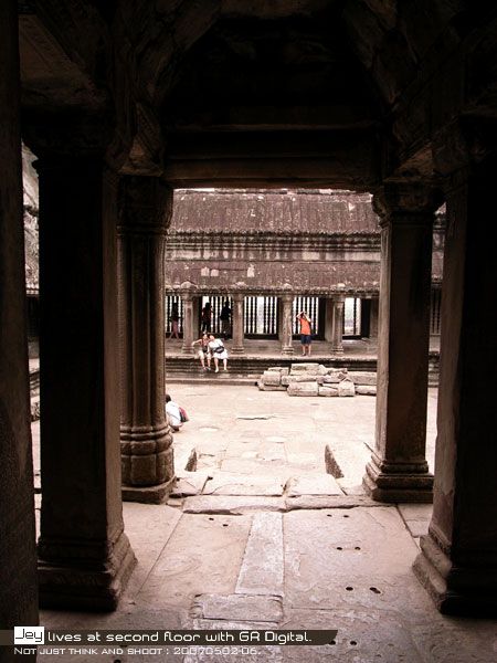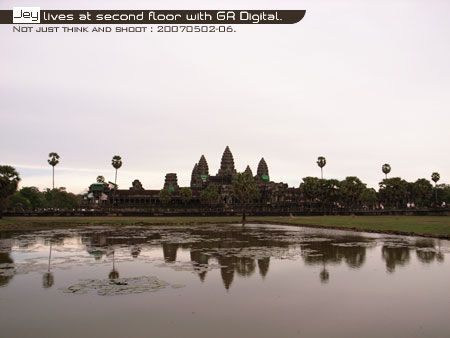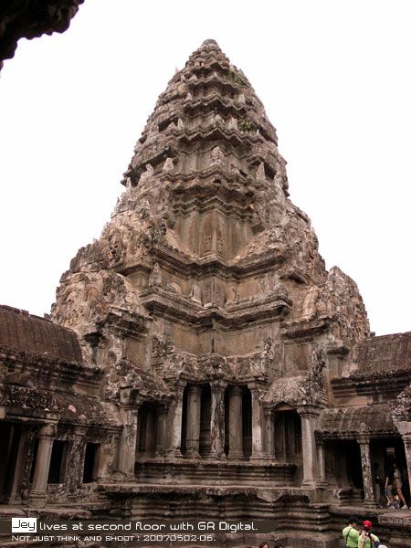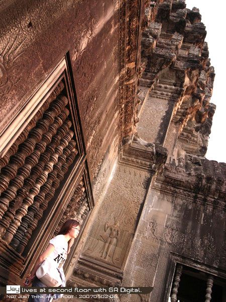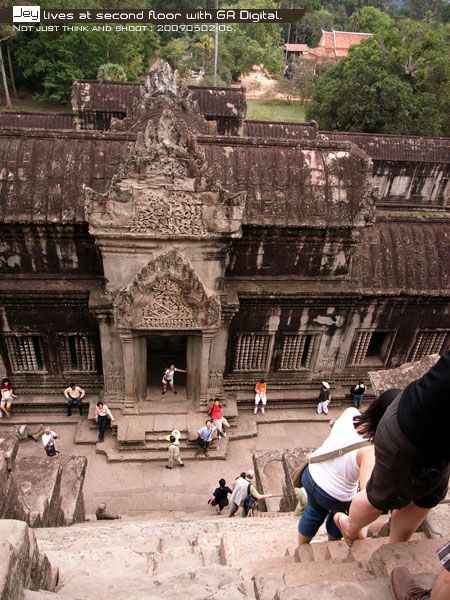 接下來就是高棉有史以來最雄偉的都城「吳哥窟Angkor Wat」小吳哥拜陽神廟,也就是早上看日出的地方。其中央有一座聖山和建築於上的廟殿,供奉保護吳哥王朝的昆濕奴神。中心塔高達65公尺,相當於20層樓高,也就是等下要攀登大天堂了。大家所知的「吳哥窟」其實指通稱「小吳哥」的神殿,我想以這面對西方的方向看來,想看「金色吳哥」應該是等夕陽餘暉的時候才對吧。