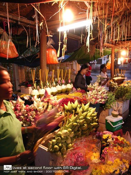 原本想說是最後一間廟了,晚飯過後離開餐廳時,團員發現旁邊有一間香火鼎盛的廟,挺熱鬧的樣子,導遊阿昌也說那是一間很靈的廟,身為台灣團怎能不去拜一下。廟的周圍就像台灣的行天宮一樣,有一些賣供品的小販,一束束的鮮花看起來很華麗。進廟裡需要脫鞋子,將鞋子放在階梯上會有小孩幫你排好,並且顧著你的鞋,當然離開要記得給小費。拿香跟著阿昌拜,希望每個人願望都能實現。